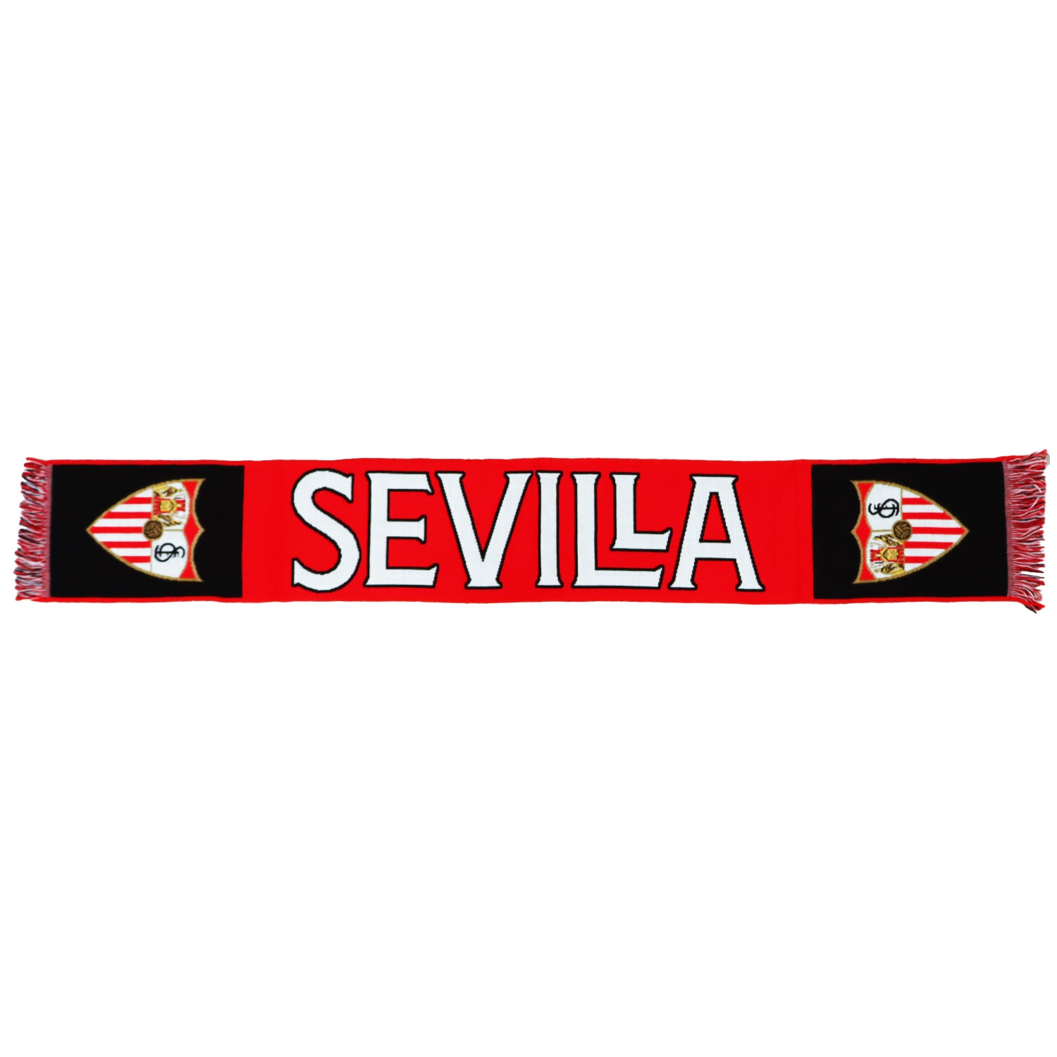Demuestra tu pasión por el Sevilla FC con esta bufanda exclusiva. Los extremos en color negro aportan un toque distintivo y moderno, rematados con flecos que completan su estilo.
