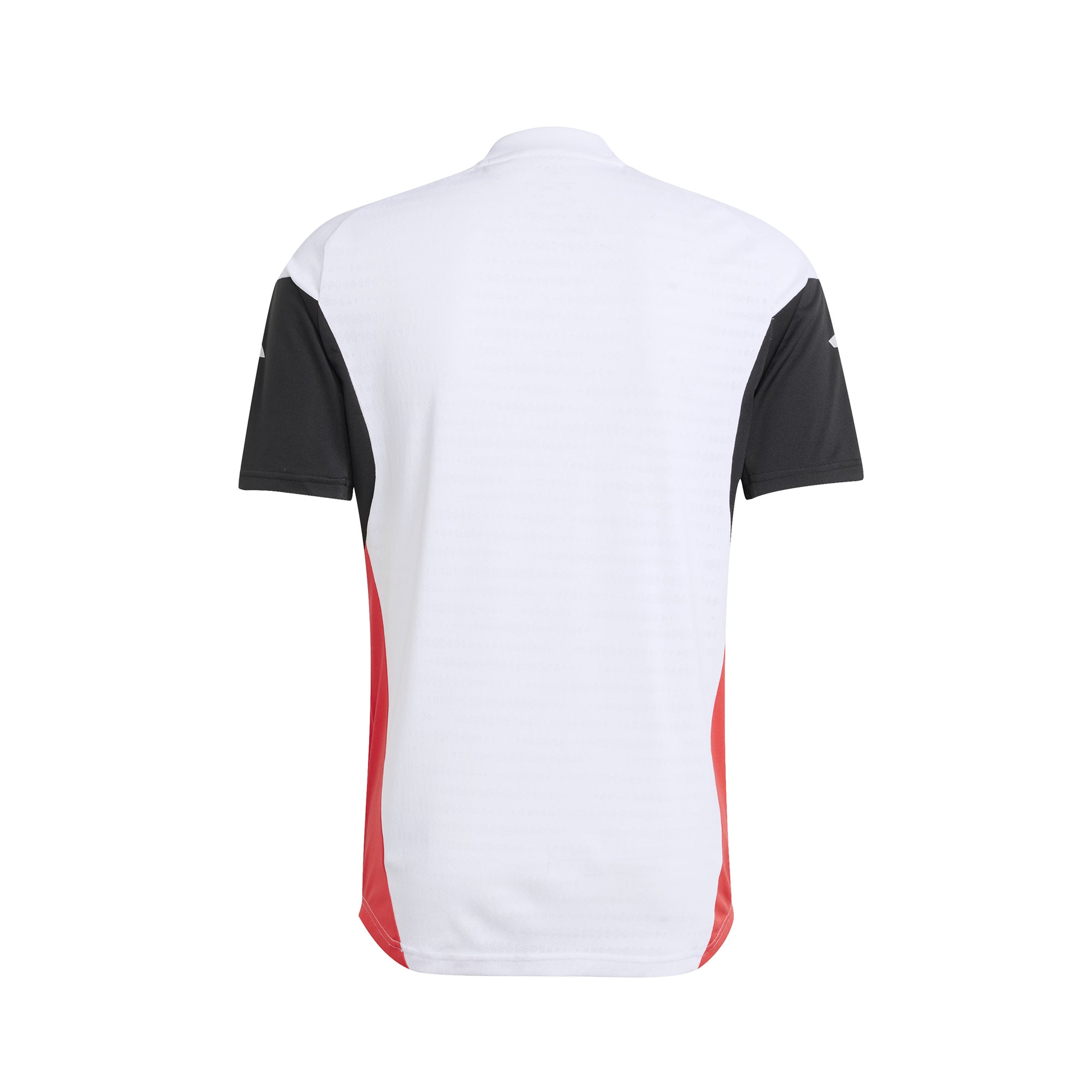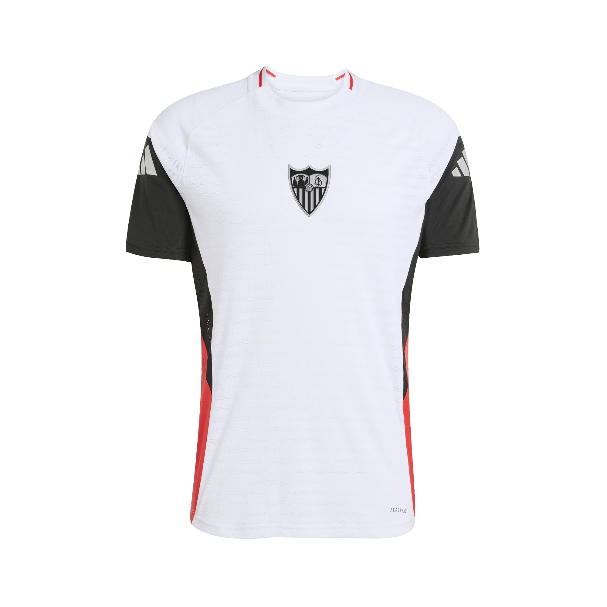 Camiseta blanca de entrenamiento para adultos con detalles laterales en color rojo y negro, el escudo del Sevilla FC en negro en el pecho, perteneciente a la Colección Oficial de Entrenamiento del Sevilla Fútbol Club para la temporada 25/26.