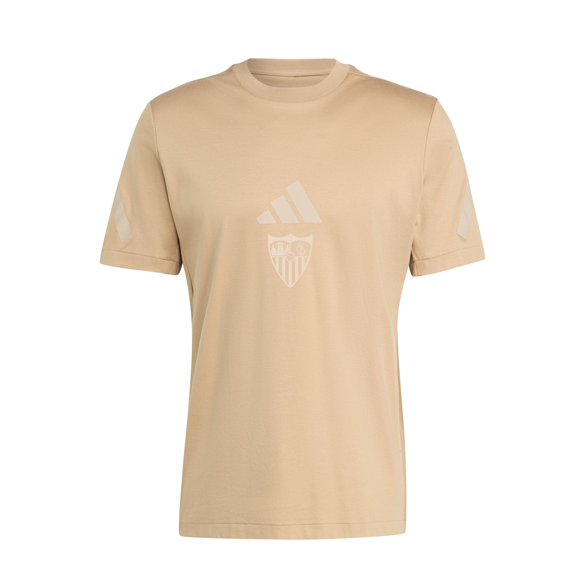 La camiseta imprescindible para adultos de la Colección Oficial de Moda Casual del Sevilla Fútbol Club para la temporada 25/26, en beige con el logo del sponsor técnico y el nombre de tu equipo serigrafiados en color beige en el pecho. Perfecta para cualquier ocasión.