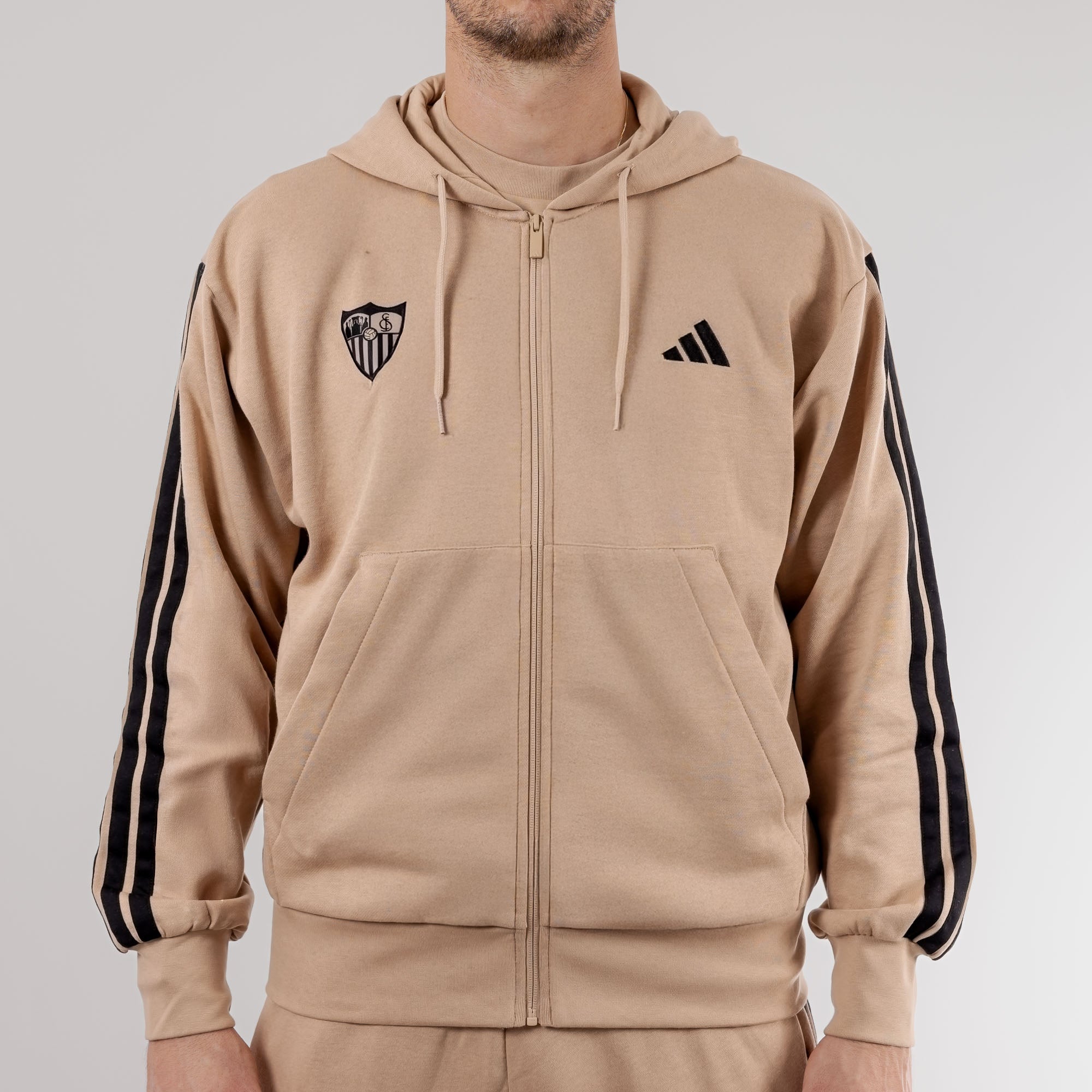 La sudadera beige para adultos, con capucha y bolsillos de canguro de la Colección Oficial del Sevilla Fútbol Club para la temporada 25/26. Lúcela en ocasiones casual con su elegante diseño con detalles laterales, sponsor técnico y escudo serigrafiados en negro en el pecho.
