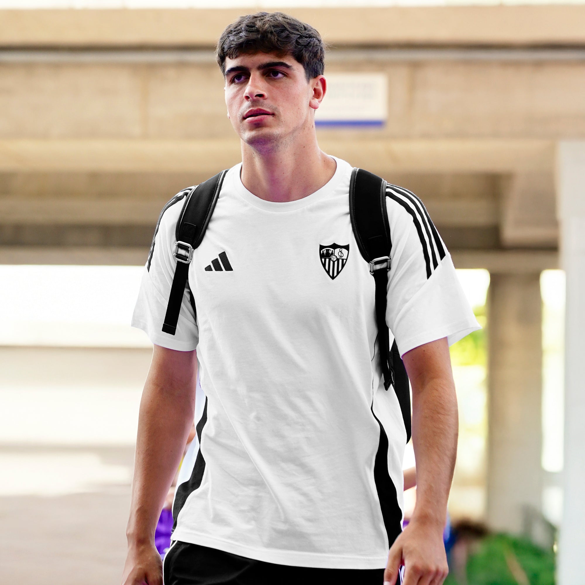 La camiseta imprescindible para adultos de la Colección Oficial de Moda Casual del Sevilla Fútbol Club para la temporada 25/26, en blanca con el logo del sponsor técnico y el nombre de tu equipo serigrafiados en color negro en el pecho. Perfecta para cualquier ocasión.