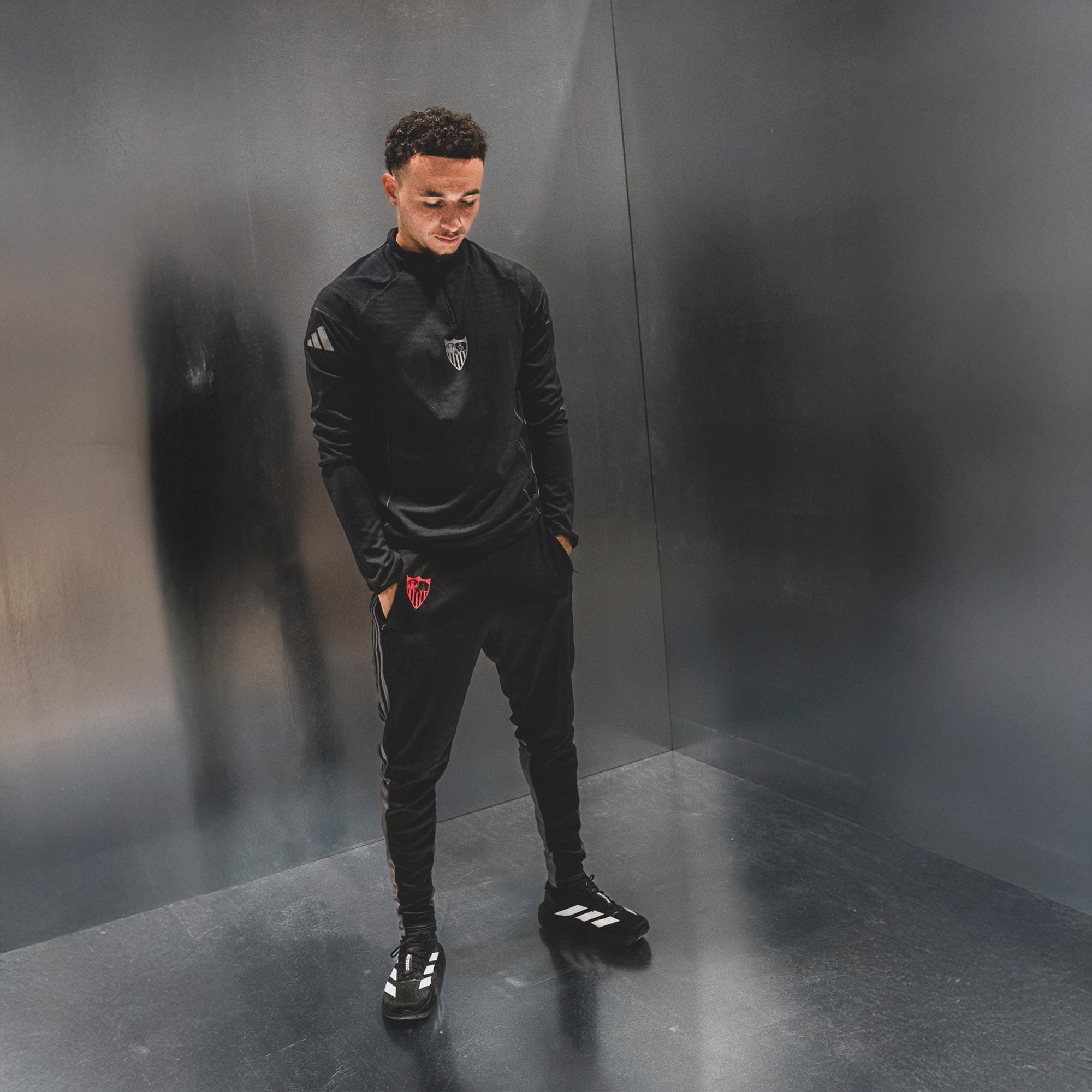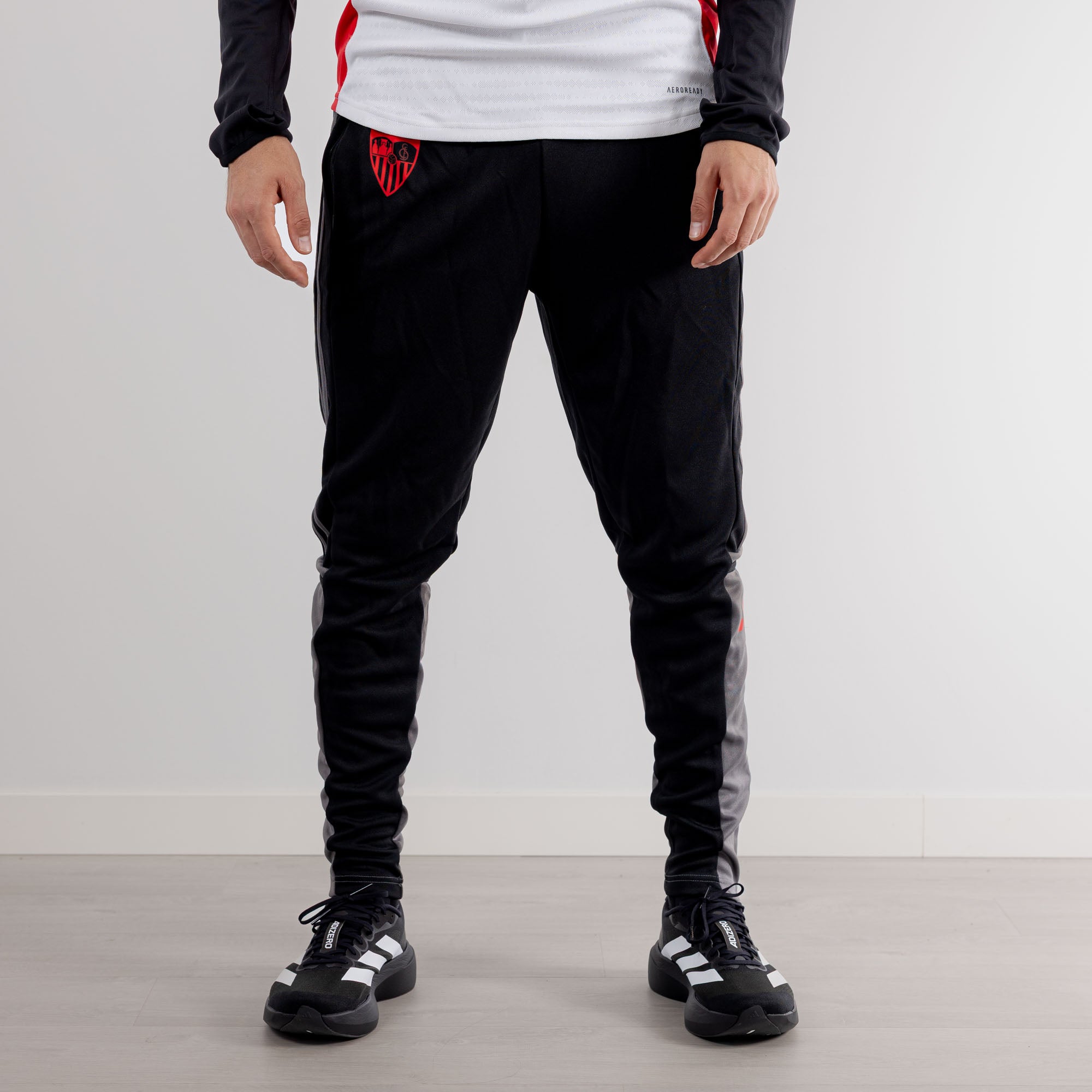 Perteneciente a la Colección Oficial de Entrenamiento del Sevilla Fútbol Club para la temporada 25/26, este pantalón negro de chándal para hombre, detalles laterales en gris y el escudo del Club serigrafiados en rojo.