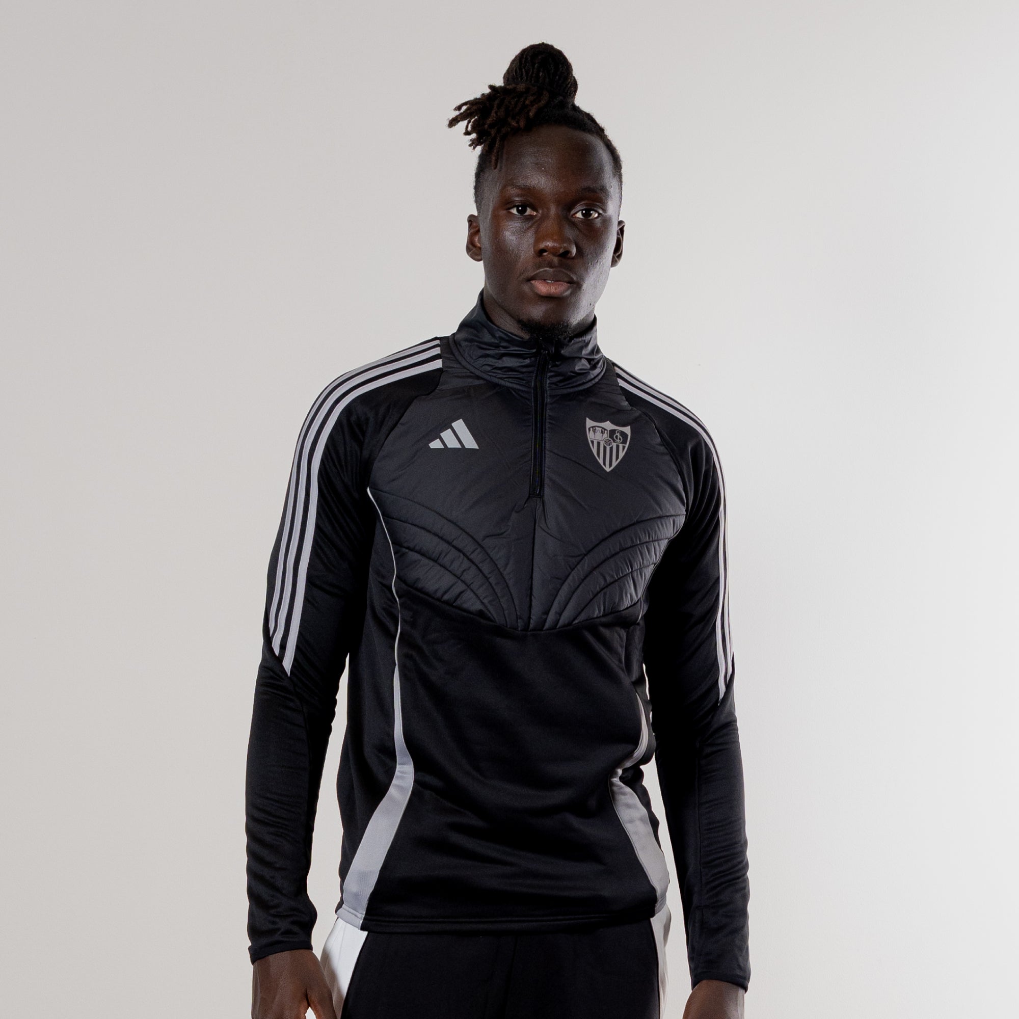Esta sudadera de entrenamiento negra pertenece a la colección especial del Sevilla FC para la temporada 25/26. Esta sudadera para adultos está diseñada en negro con detalles blancos en laterales y hombros y luce el escudo del Club serigrafiado en blanco.