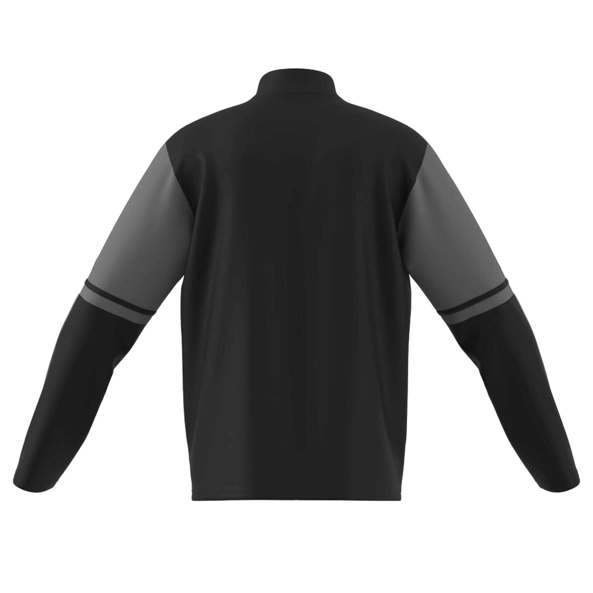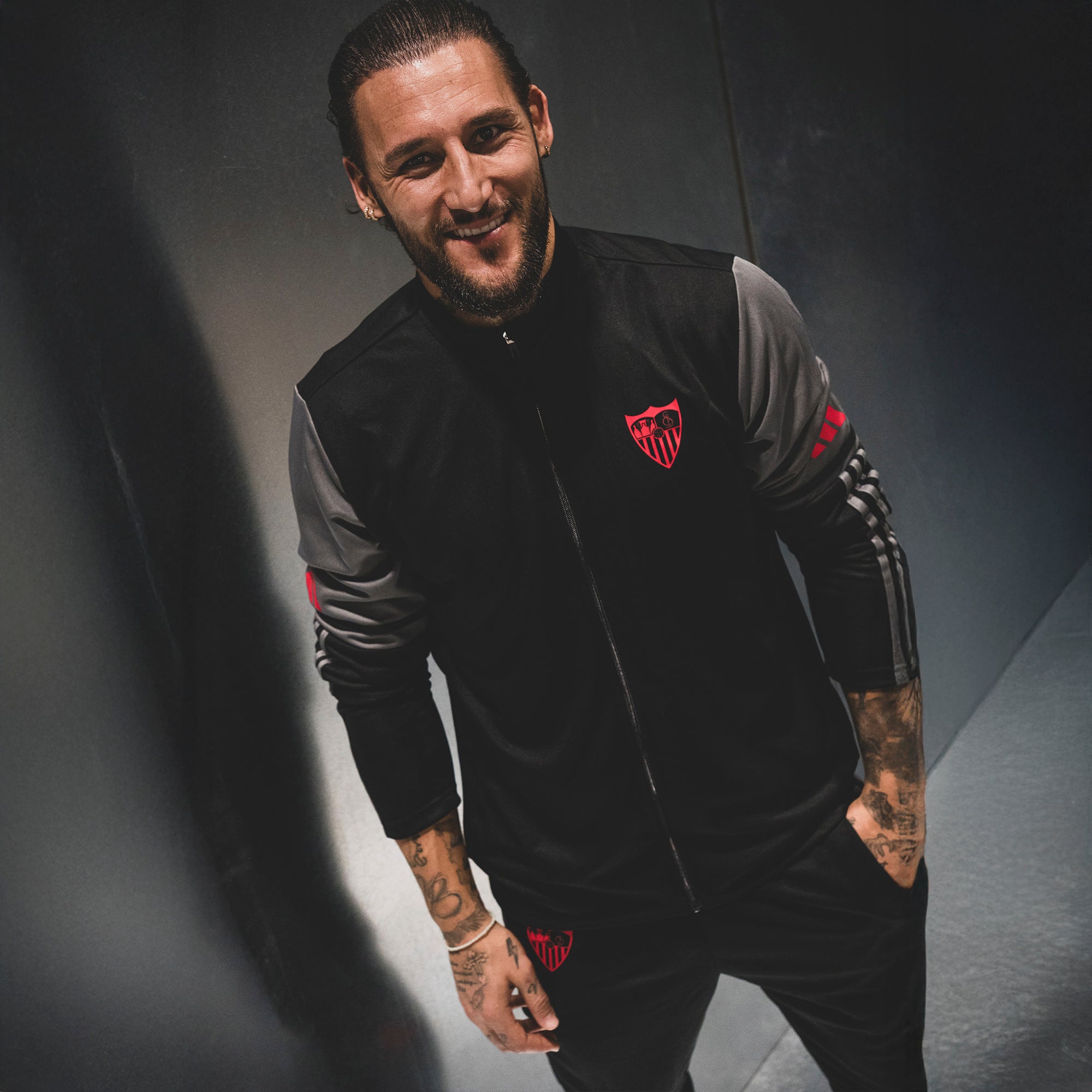 Sudadera negra del Sevilla FC con detalles en color gris, cremallera central y logo del sponsor técnico en las mangas y escudo del Club serigrafiados en rojo sobre el pecho . Cuenta con bolsillos con cremallera (laterales).